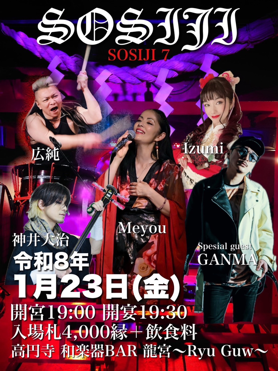 《SOSIJI 7》令和8年1月23日(金) 高円寺【和楽器BAR 龍宮〜Ryu Guw〜】高円寺 "和楽器BAR 龍宮〜Ryu Guw〜" 開宮19:00 開宴19:30 入場札4,000縁➕飲食料 《出演》 Meyou(vo) Izumi(Flute,篠笛) 神井 大治(三味線) 広純-HIROZUMI(和太鼓) Special guest Ganma (rap) WEB https://www.ryuguw.com/